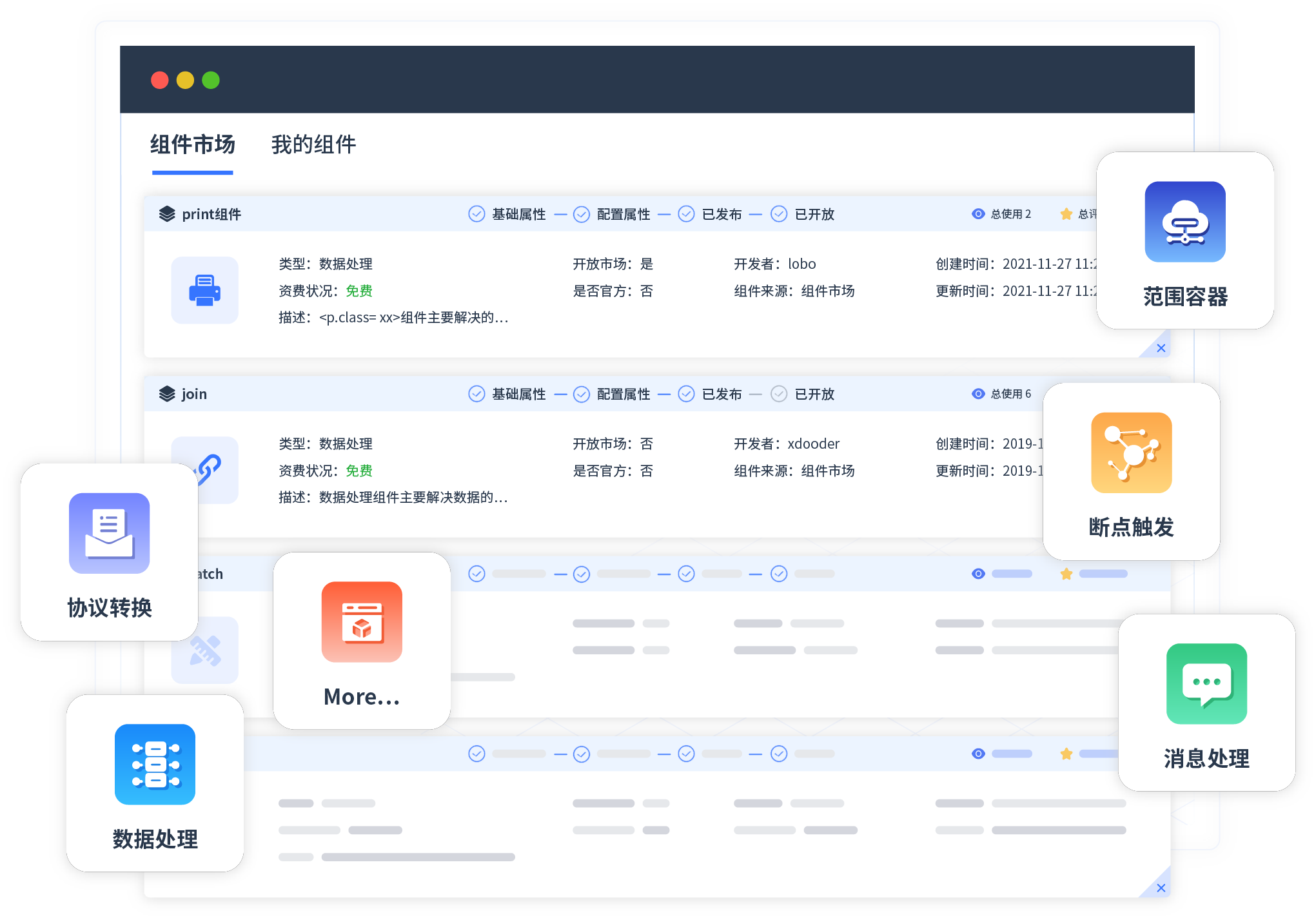 针对集成场景,,GOPAY钱包提供组件市场,,,例如协议转换、、消息处理、、、、文件操作等。。。。除平台提供的组件外,,,,客户可以自定义所需组件。。。。