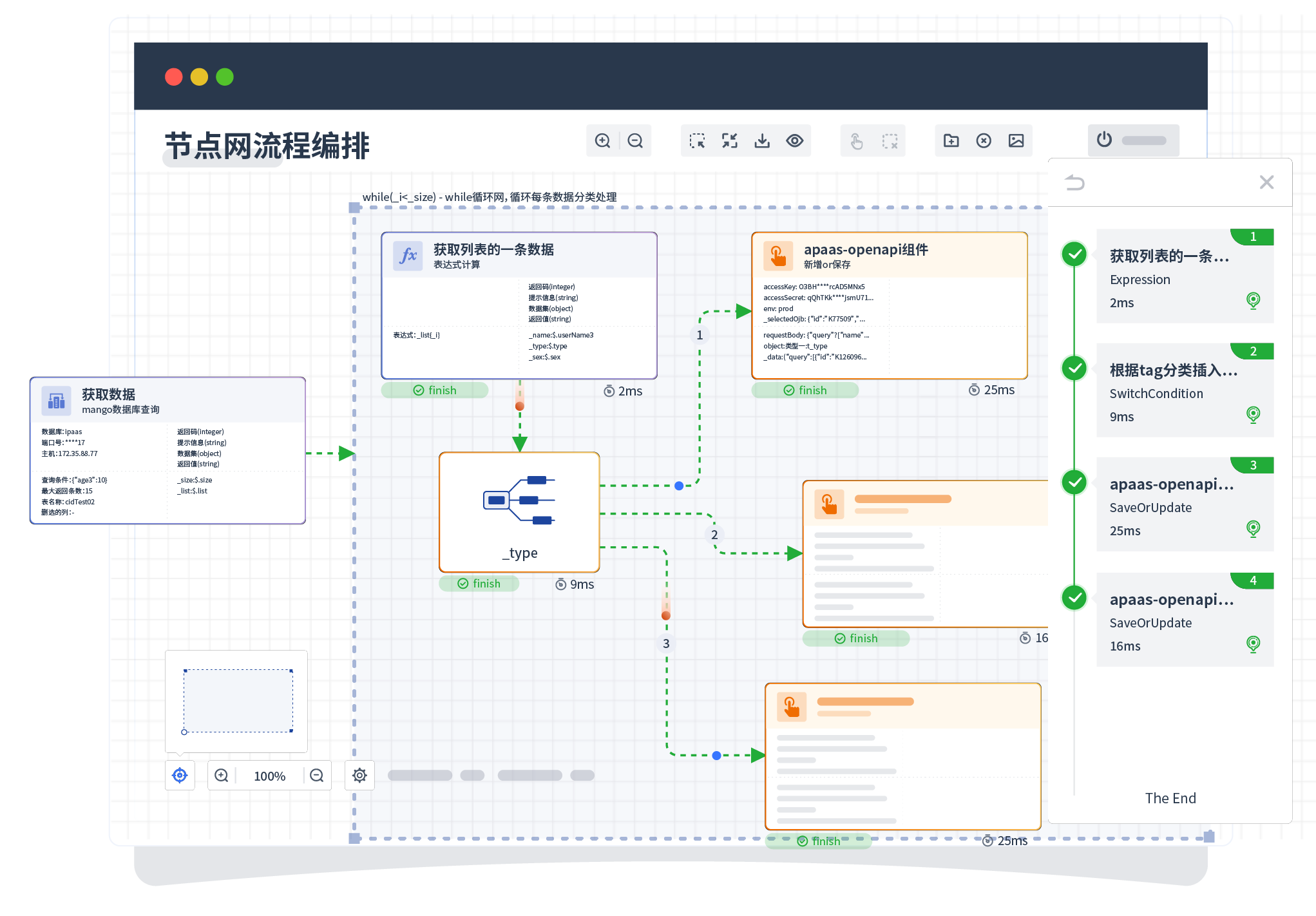 针对集成场景,,,组件定义后支持进行流程编制,,,,不同于传统代码方式,,,,通过图形化展示,,,,支持在线调试、、日志查看和运行回放。。。。